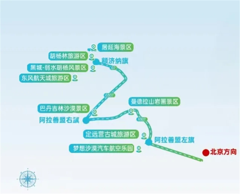 这是一条穿越沙漠,聆听生命赞歌的旅程,您会惊叹胡杨林不朽的生命、沙漠海子的勃勃生机,也会崇尚载人航天精神、探秘居延海·黑城遗址遗迹、品鉴骆驼系列美食。