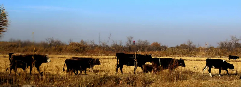 不远处,牛羊悠闲地漫步在岸边和田野上,它们的身影悠闲自在,成为这幅风景画中的一抹温馨色彩。牛儿低头啃食着枯黄的草叶,偶尔抬头望向远方,眼神中透露出满足与安详;羊群则像一朵朵白云,散落在金黄的草地上,随着牧人的节奏缓缓移动,享受着冬日暖阳下的宁静时光。