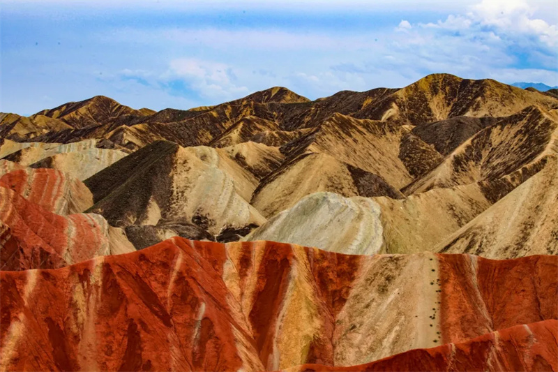 彩色丘陵,作为七彩丹霞的核心组成部分,它主要由红色砂砾石、砂岩和泥岩组成,地势平缓,却有着独特的韵律之美。山体纹理叠加有序,脉络清晰可见,仿佛是大自然用细腻的笔触勾勒出的精美图案。