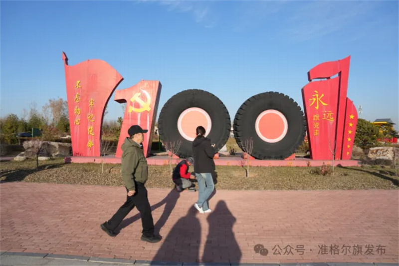 下午,考察团来到准能矿山生态旅游区。这里曾是国能准能集团黑岱沟露天煤矿的开采区,如今已蜕变为绿意盎然的生态公园。废旧轮胎、设备零件被巧妙改造成景观小品,生动展现现代工业文明与生态修复的融合。民族复兴柱与56个民族团结柱庄严矗立,象征着各族儿女同心筑梦。代表们沿步道漫步,不时停下记录眼前景象,感叹这片土地由“黑”转“绿”的“准能奇迹”。