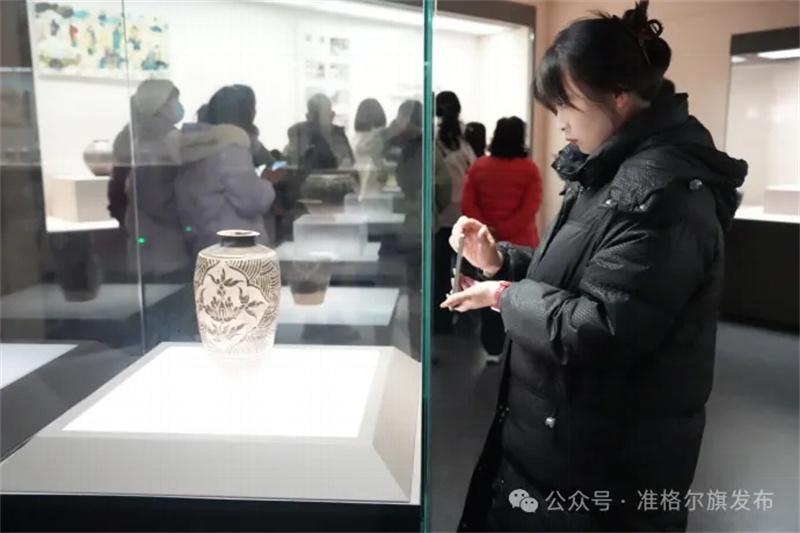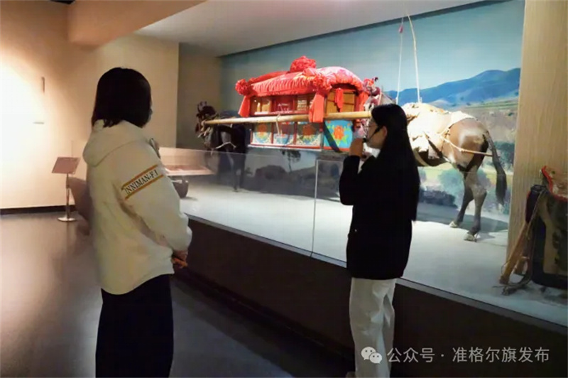 上午10点,考察团首先走进准格尔旗博物馆,寨子圪旦、大口、永兴店、百草塔等遗址的历史印记缓缓铺陈。馆藏文物带着远古的回声,红玛瑙与绿松石制成的匈奴贵族妇女头饰、“骡驮轿”婚俗、以石为器的“六六八八”菜品等民俗展品,吸引代表们频频驻足、拍照记录。“漫瀚调、骡驮轿娶亲等民俗,以及准格尔粗瓷烧作技艺、地毯植物染色技艺等非遗,极具地方特色,非常适合作为研学游和文化游的重要内容。”准格尔旗青少年研学旅游有限公司的贾飞表示。