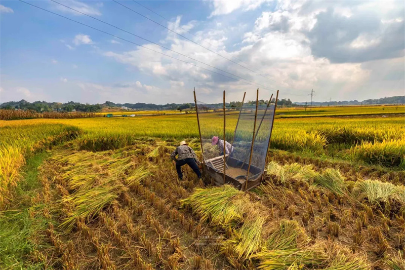 秋收时节的南坪,是金黄色的喜悦。田野里稻穗饱满,羞涩低头,清风裹挟着浓郁稻香,收割机轰鸣着奏响丰收欢歌,喜庆挂满季节末梢。