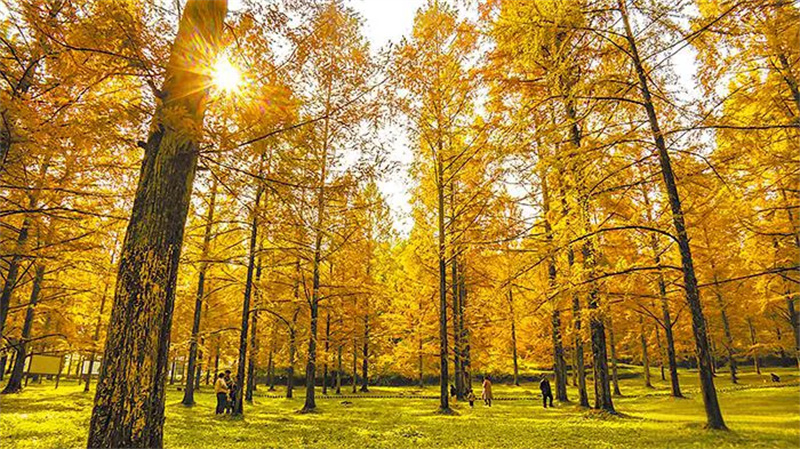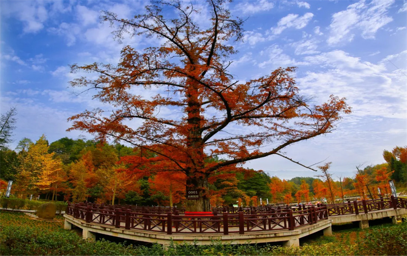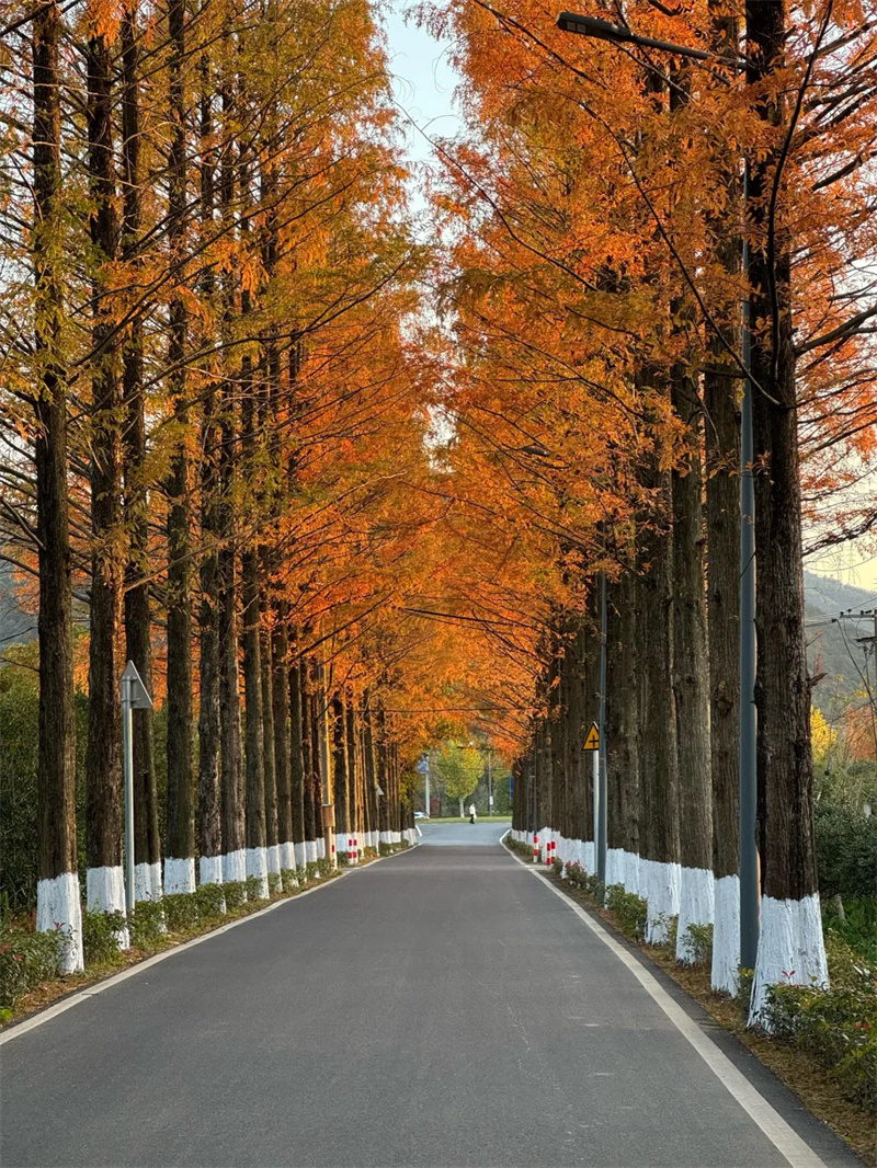 这里是水杉 “活化石” 的故乡,初秋便换上古铜色盛装。成排列植的水杉直指苍穹,阳光穿透枝叶洒下斑驳光影,每一片叶片都在诉说着岁月的故事,迷倒无数爱秋之人。