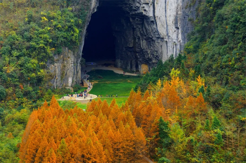 海拔1500米的红椿,藏着利川最早的秋。寒冷气候让水杉红叶提前登场,热情似火的叶片铺满公路,化作迎接旅人最隆重的 “红地毯”,车行其间,步步皆景。