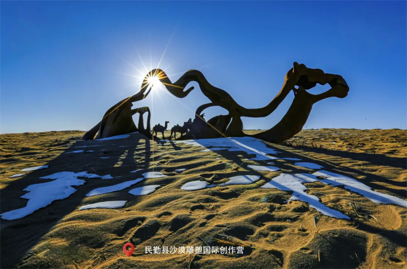 下午打卡沙漠特色:沙漠雕塑创作营看132件艺术作品与大漠白雪相映,夜晚在摘星小镇用全天域望远镜观银河,体验“手可摘星”的浪漫。