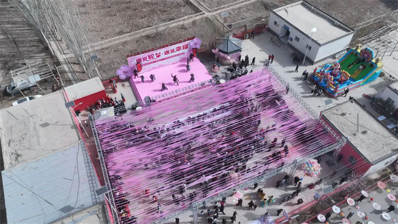 开幕式现场,舞台与杏花实景相融,一场沉浸式视听盛宴精彩上演。动感的开场舞瞬间点燃现场气氛,随着赏花季正式启动的指令发出,空中杏花花瓣雨漫天飘落,数百只幸福气球腾空而起,现场欢呼声、喝彩声此起彼伏。杏花仙子机器人、机器狗的趣味表演让大人小孩连连拍手,民俗舞蹈、白杏产业主题走秀、非遗节目轮番登场,将轮台的民俗风情与白杏文化展现得淋漓尽致。