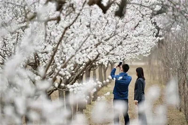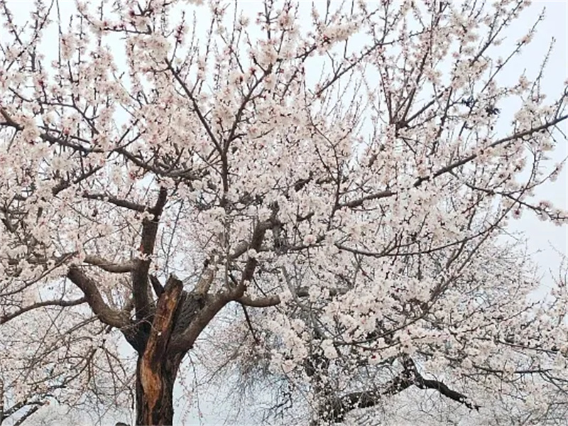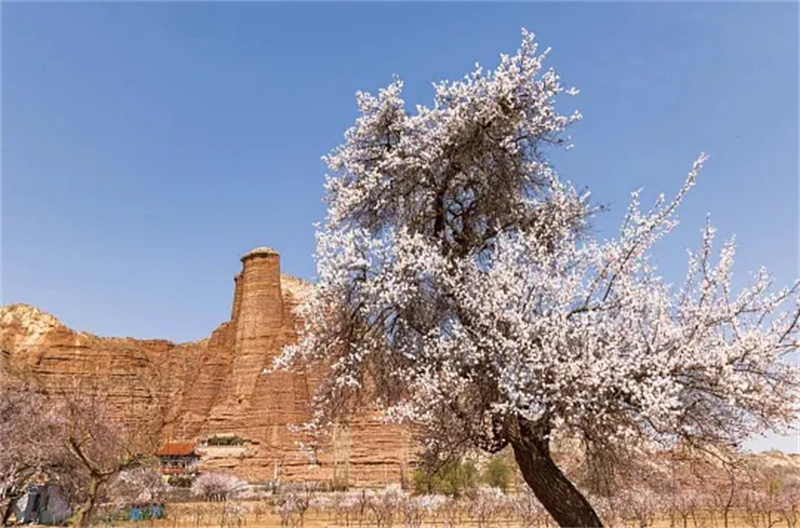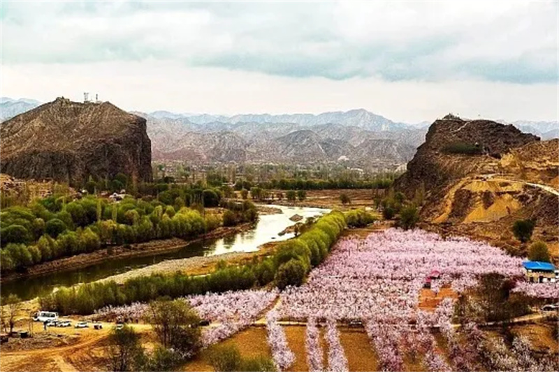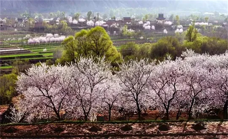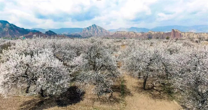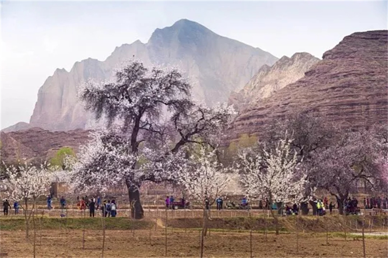这里的杏花以“素净雪白”为特色,初绽时带淡淡粉红,盛放后则呈现漫川雪白的壮观景象,搭配潺潺洮河与远处丹霞地貌,构成极具西北特色的春日画卷。