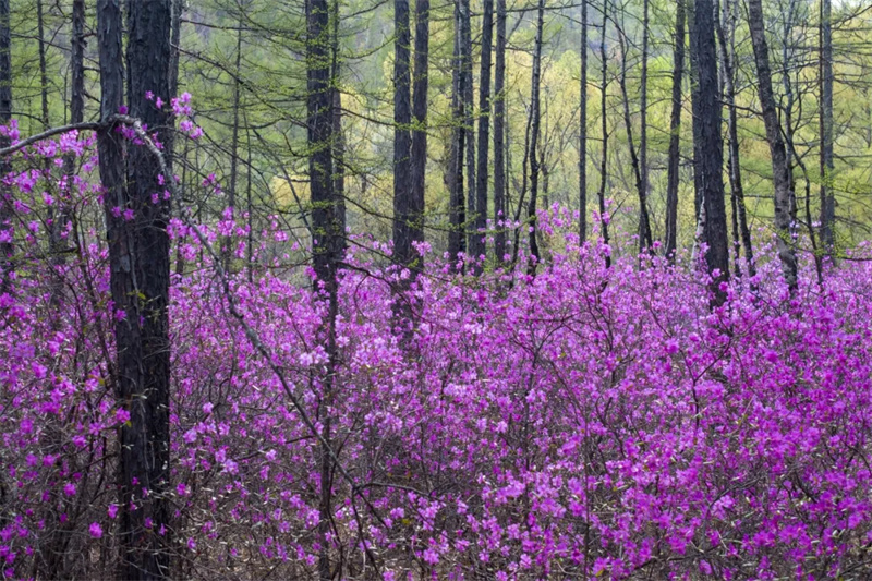 兴安杜鹃是阿尔山极具代表性的春日花卉,生命力顽强,每到春日,杜鹃花海便以漫山遍野的嫣红召唤着踏春人,连片盛开蔚为壮观,日光一照更衬得明艳热烈。穿上漂亮的旅拍服装,与好友结伴而行,穿行在烂漫花海中,尽览北疆春日的盎然诗意。