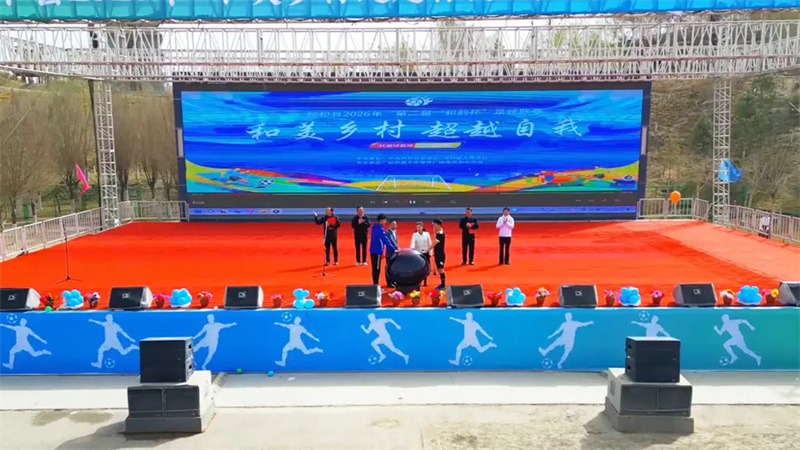 在全场的期待与欢呼声中,县委书记李俊杰与县委副书记、县长巴哈尔古丽·艾麦提及裁判代表、运动员代表共同上台按动启动球,正式宣布新和县2026年第二届“和韵杯”足球联赛开赛。