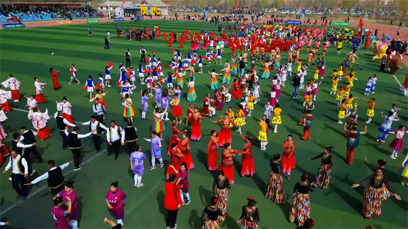 开幕式尾声,文化馆演职人员唱响歌曲《奔跑》,非遗传承人奏响民族乐器,全场跳起欢快的麦西来甫,歌舞交融、其乐融融,尽显各族群众团结和睦、乐享生活的美好画面。