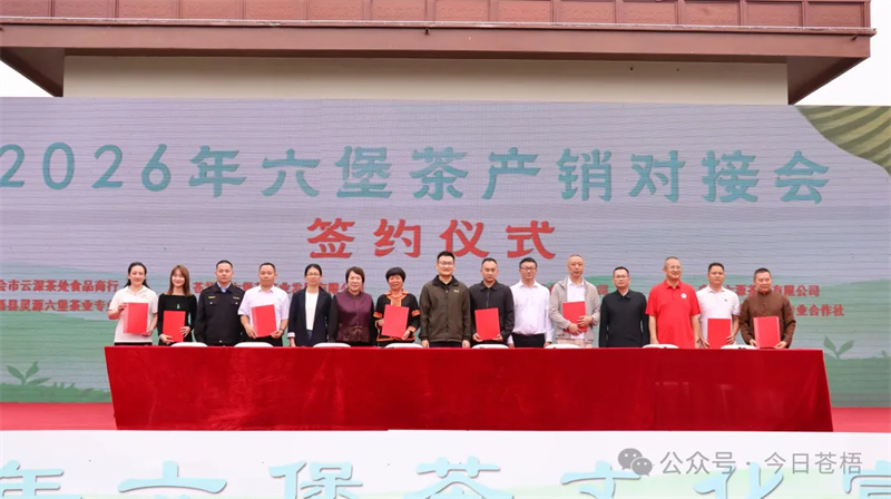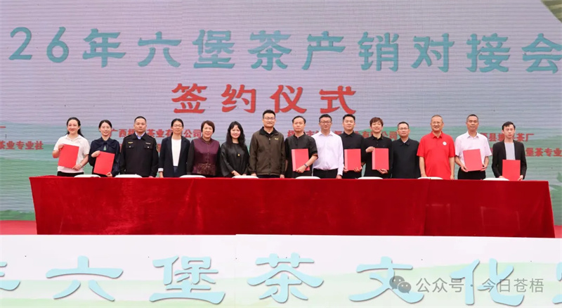 此次开茶节不仅是一场文化盛会,更是产销对接的重要桥梁。在本次开茶节产销对接大会上,8组企业、合作社代表在县委副书记马士成,县委常委、宣传部部长麦贵福,县人大副主任曾庆梅等领导及嘉宾的共同见证下,顺利签订产销合作协议,签约金额超亿元。此次开茶节为苍梧本地茶企、专业合作社搭建起高效便捷的产销直通平台,有效串联茶叶生产、加工与市场流通等关键环节,进一步畅通销售渠道,更有力提升了苍梧六堡茶的品牌知名度与市场影响力,带动茶农增收致富,为六堡茶产业提质增效、乡村振兴注入强劲动力。