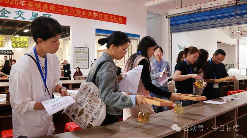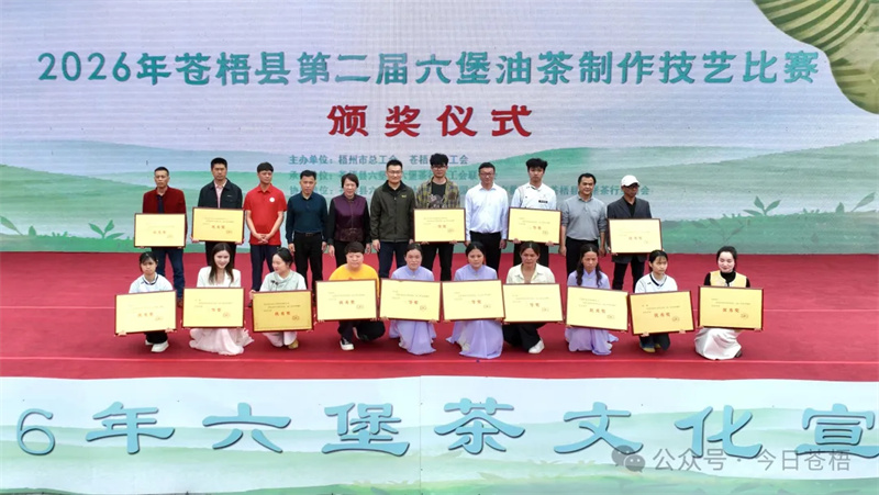 春和景明,茶韵飘香。2026年苍梧县第二届六堡油茶制作技艺比赛颁奖仪式中国六堡茶第一街圆满举行。县委副书记马士成,县委常委、宣传部部长麦贵福,县人大常委会副主任、总工会主席曾庆梅等领导出席,与嘉宾、茶界同仁共同见证15名获奖选手的荣耀时刻,充分展现六堡油茶制作技艺的传承成果。