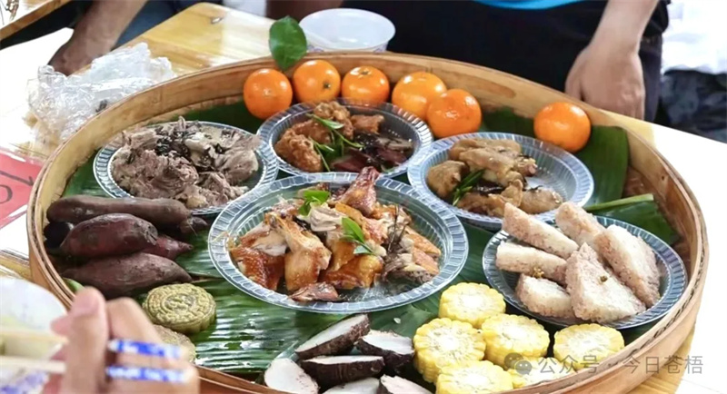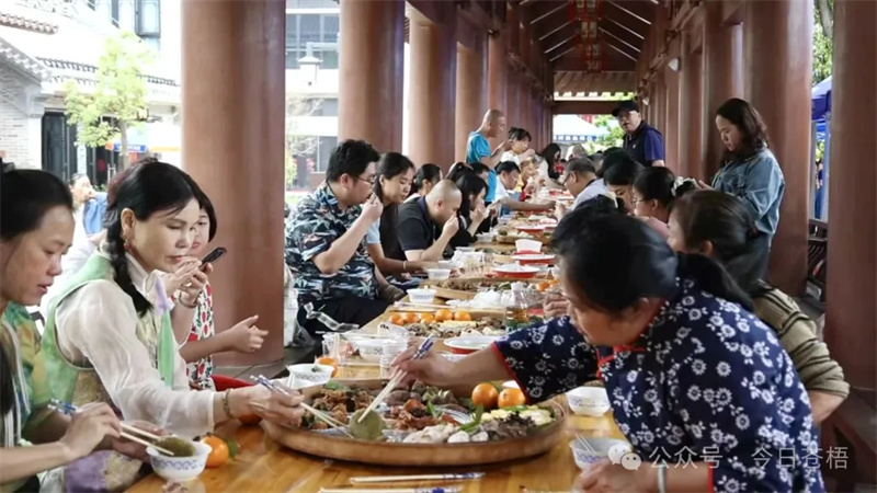 中国六堡茶第一街广场旁的长廊里,长桌宴在一片欢声笑语中拉开帷幕。游客们有序入座,茶香鸡、烧猪肉、豆腐酿、茶香排骨等极具茶乡特色的地道菜色摆放在箩筐里。大家围坐在一起,一边品尝着美食,一边畅所欲言。夹起一块茶香鸡,品味茶香与肉香的交融,一道道农家菜,饱含着浓郁的乡土气息,每一口都令人陶醉。