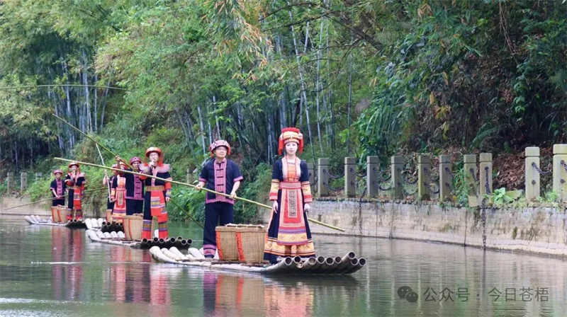 六堡河上,“茶船古道”场景重现活动在晨光中徐徐展开。数只竹排满载茶担,依次排开,船夫们撑着长篙,缓缓驶入河中。茶娘立于排头,亮起嗓子唱起山歌,歌声清亮悠扬,在两岸青山间回荡,仿佛将人们带回了昔日六堡茶沿水路远销海外的年代。茶担里装着的不仅是茶叶,更是六堡茶人代代相传的坚守与情怀。岸上观众纷纷举起手机,定格这一幅幅生动的画面。竹排渐行渐远,歌声余音袅袅,千年茶香仿佛在水波间流淌不息。